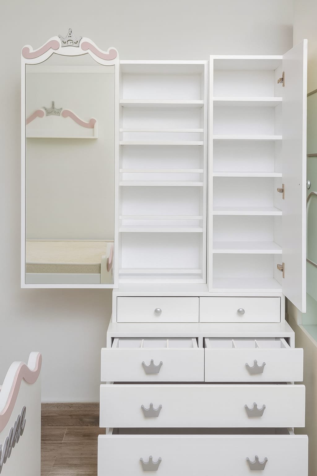 • Upper small drawers for organizing small items and hair accessories