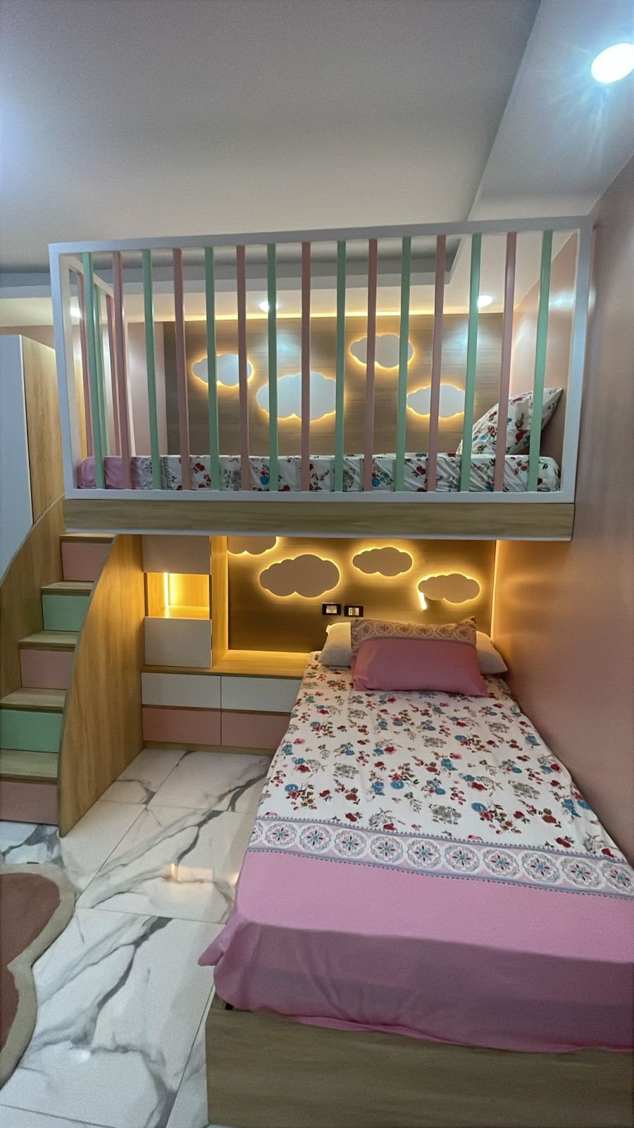 Decorative LED cloud lighting behind both beds adds a cozy and playful atmosphere.