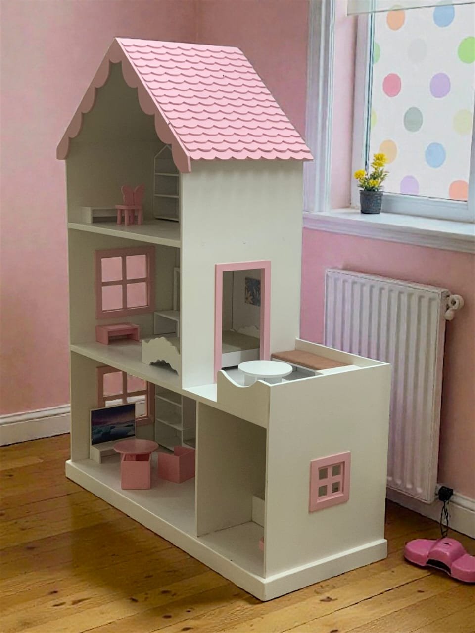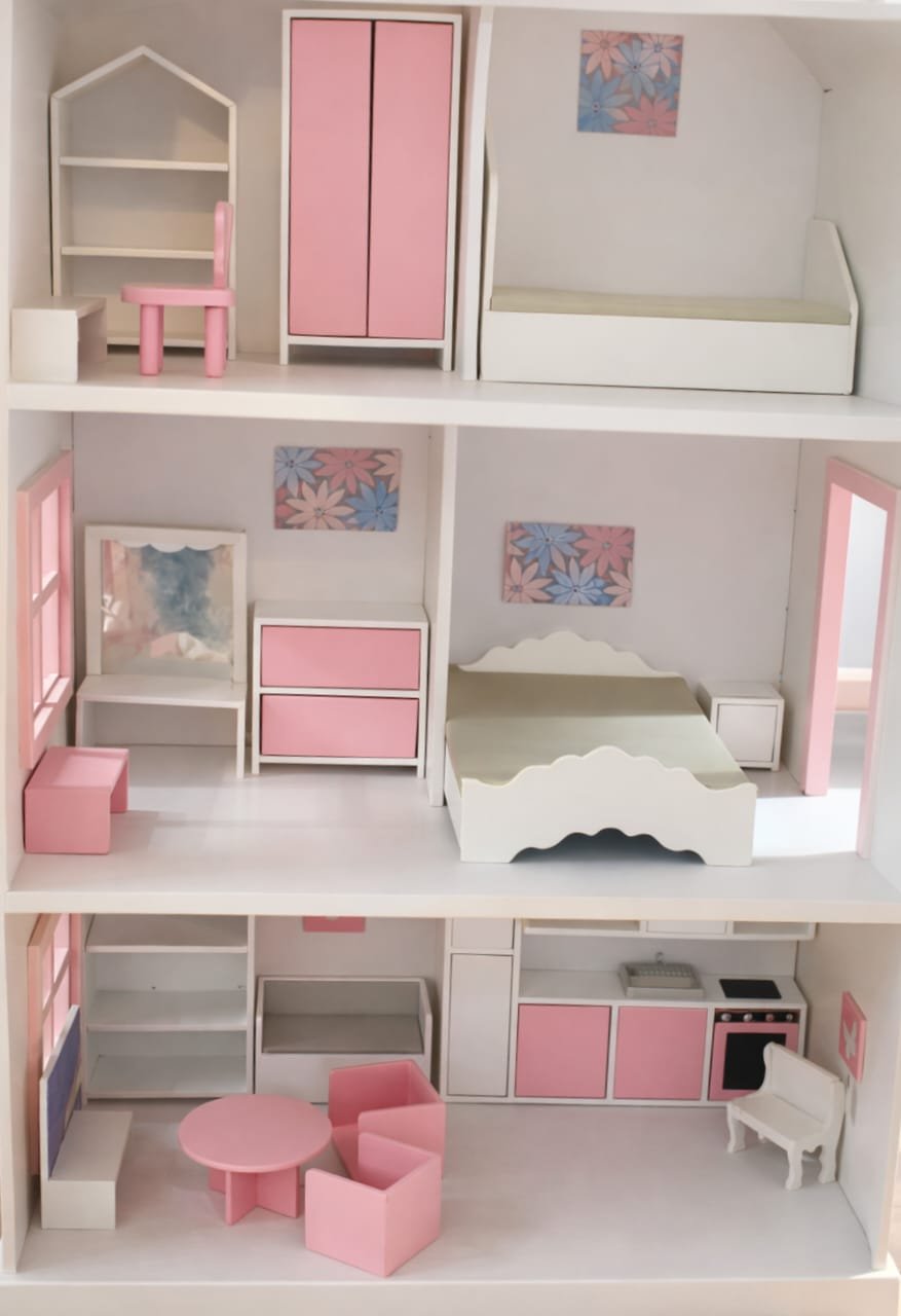 Elegant wooden dollhouse designed in soft pastel pink and white tones