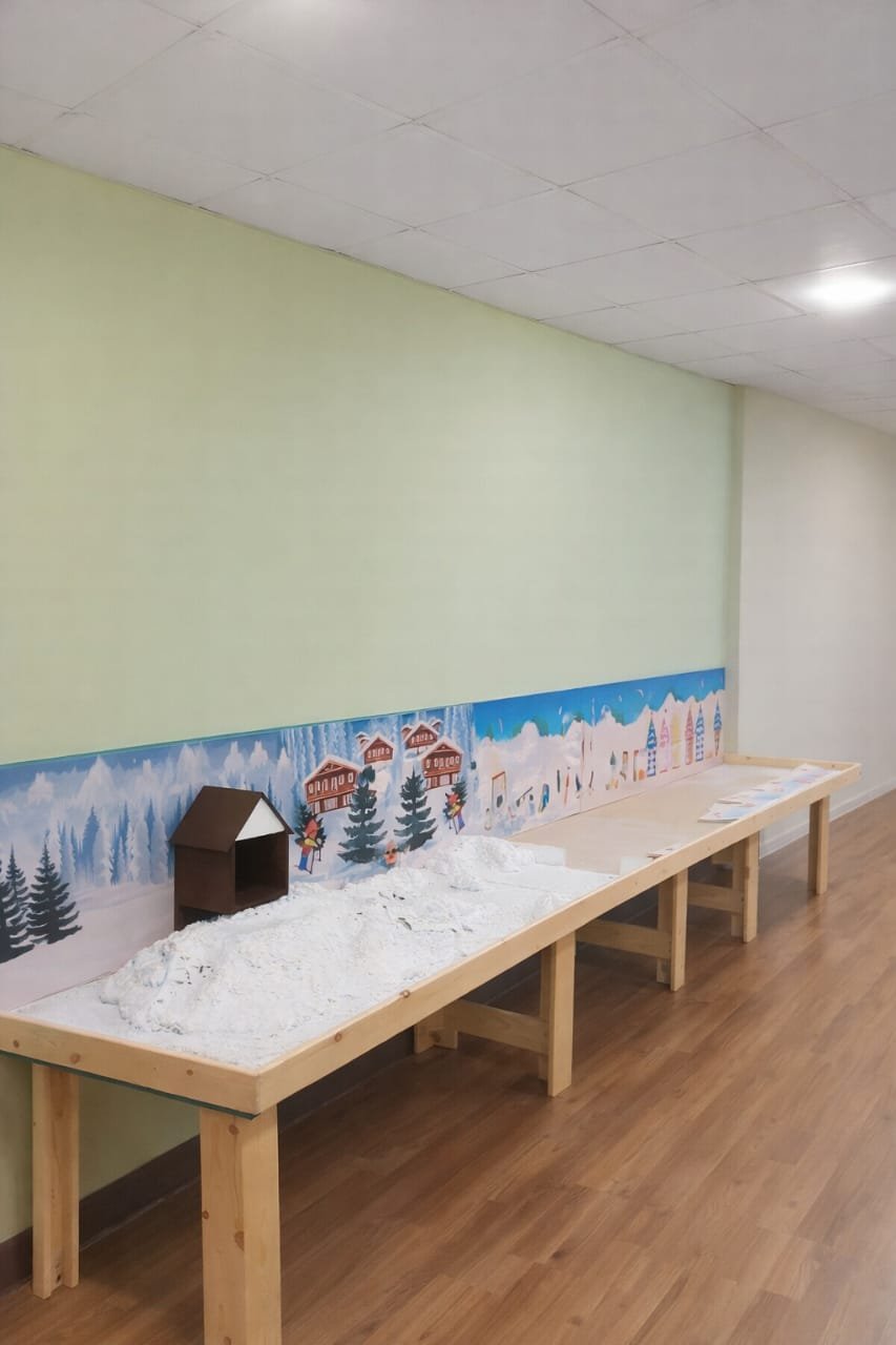 Wall decorated with a colorful winter-themed mural featuring mountains, trees, and skiers