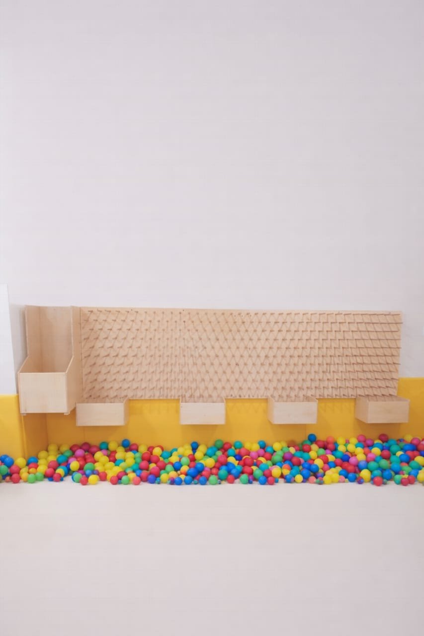 Includes five open-bottomed wooden boxes for ball or object collection